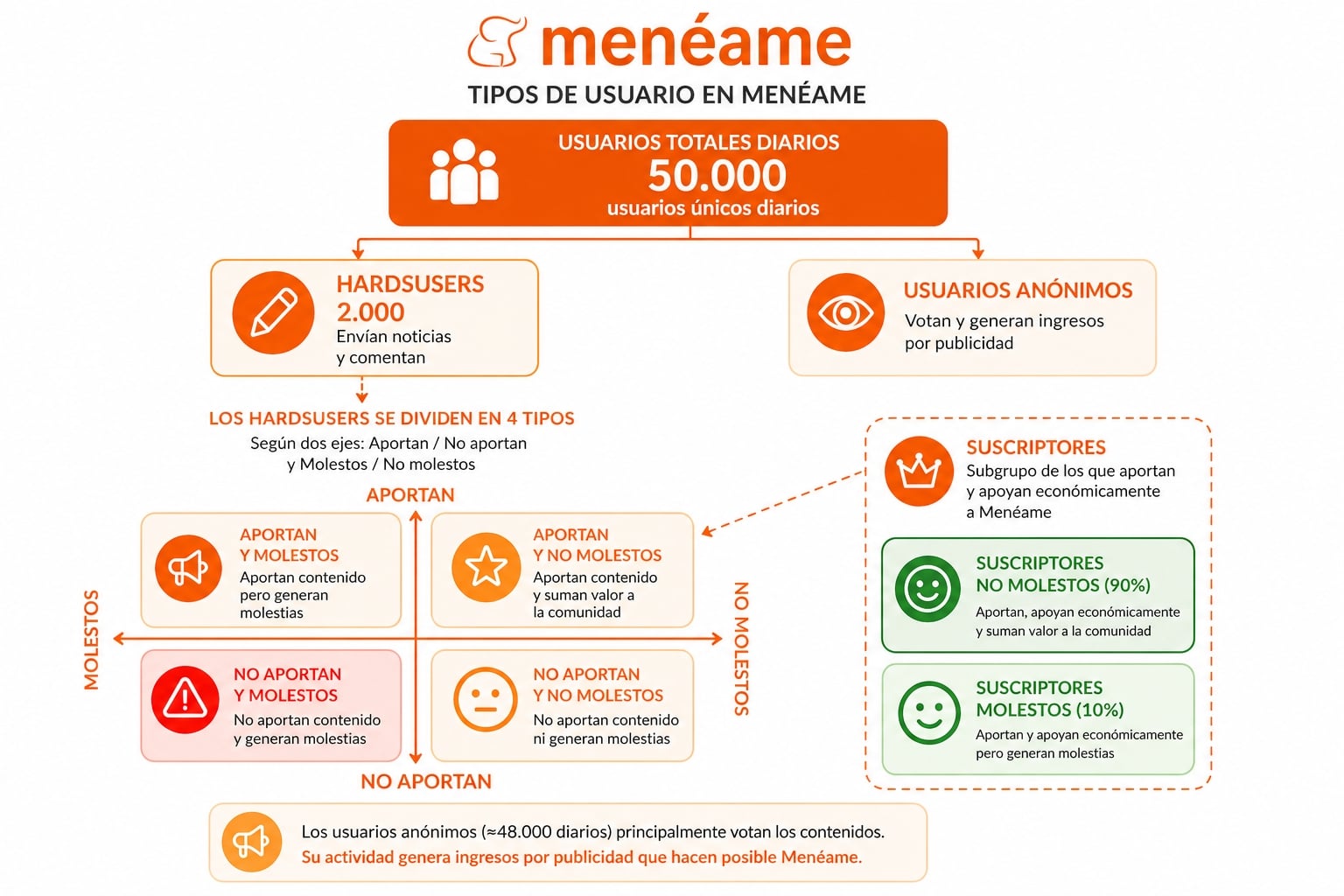 Este gráfico muestra de manera resumida el perfil de usuarios de Menéame. Como ya he dicho muchas veces, los ingresos los obtenemos principalmente de la publicidad que generan los usuarios anónimos y en segundo lugar los sucriptores.